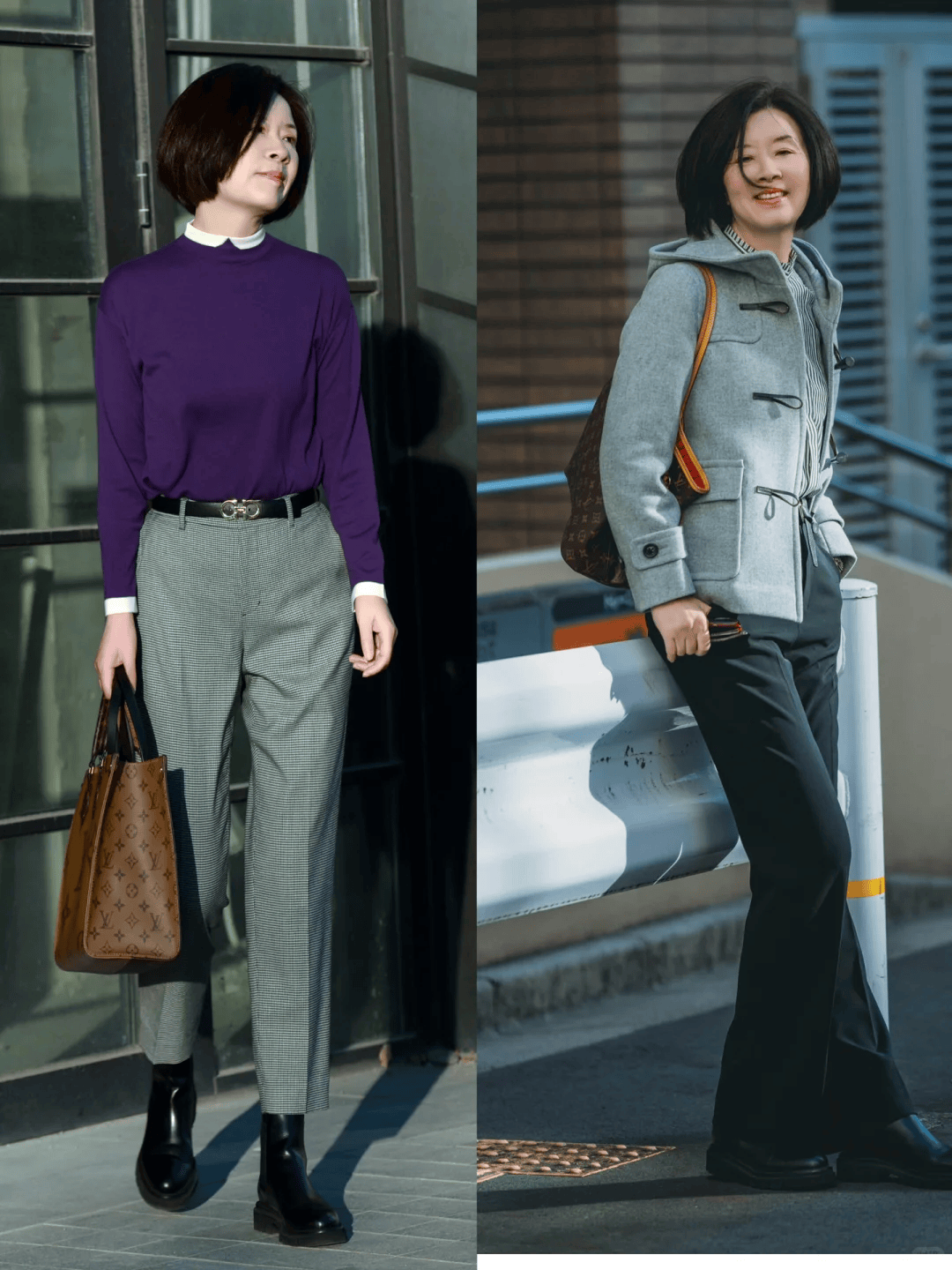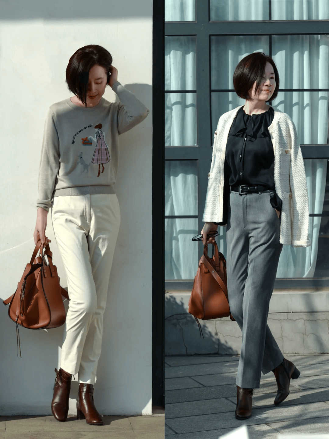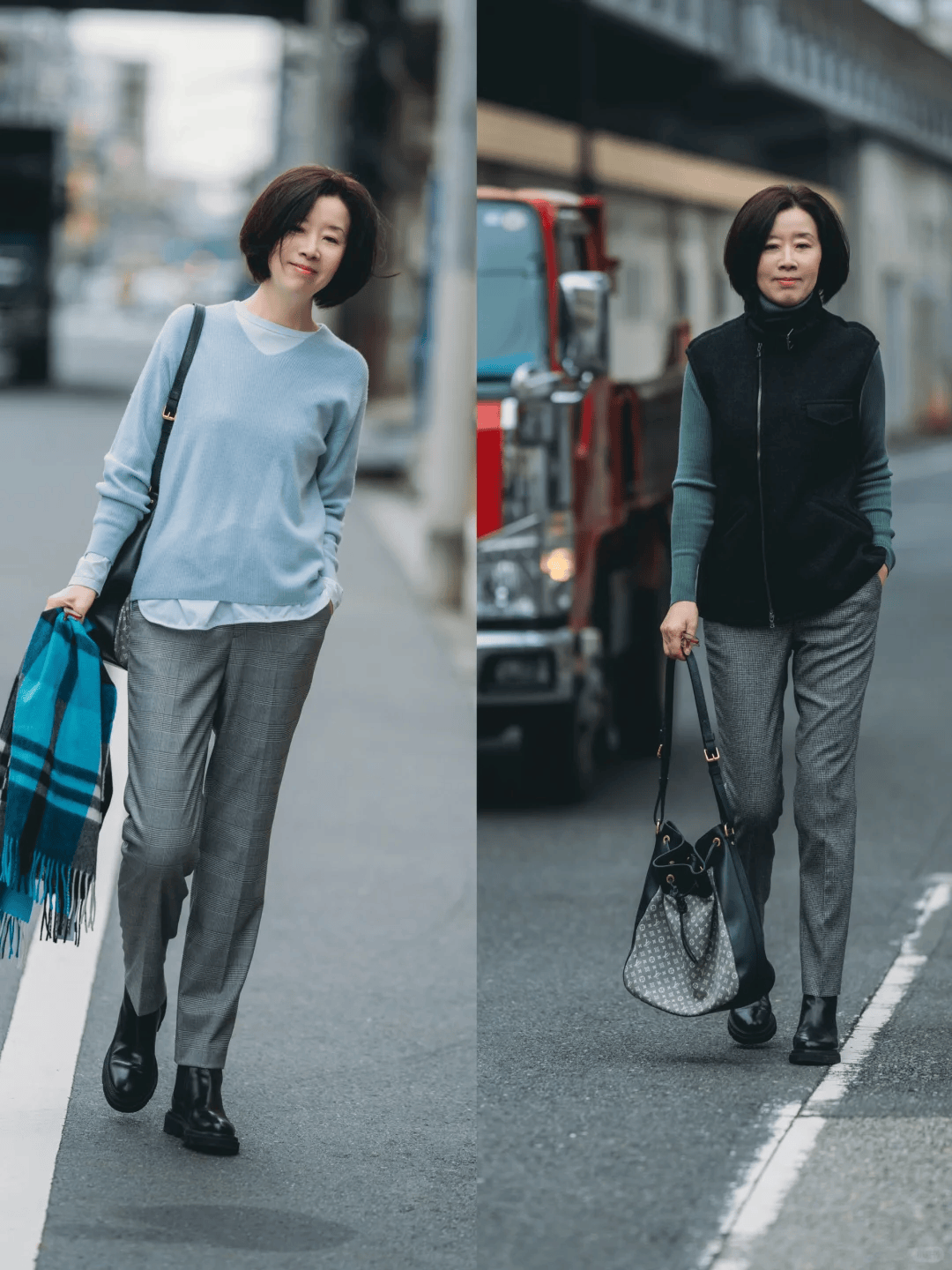 经典的灰色烟管裤,属于是经典又百搭的单品,春季搭配针织衫,马甲外套都可以,针织衫+衬衫叠穿,再配一条灰色烟管裤,踩一双黑色短靴,气质绝了。