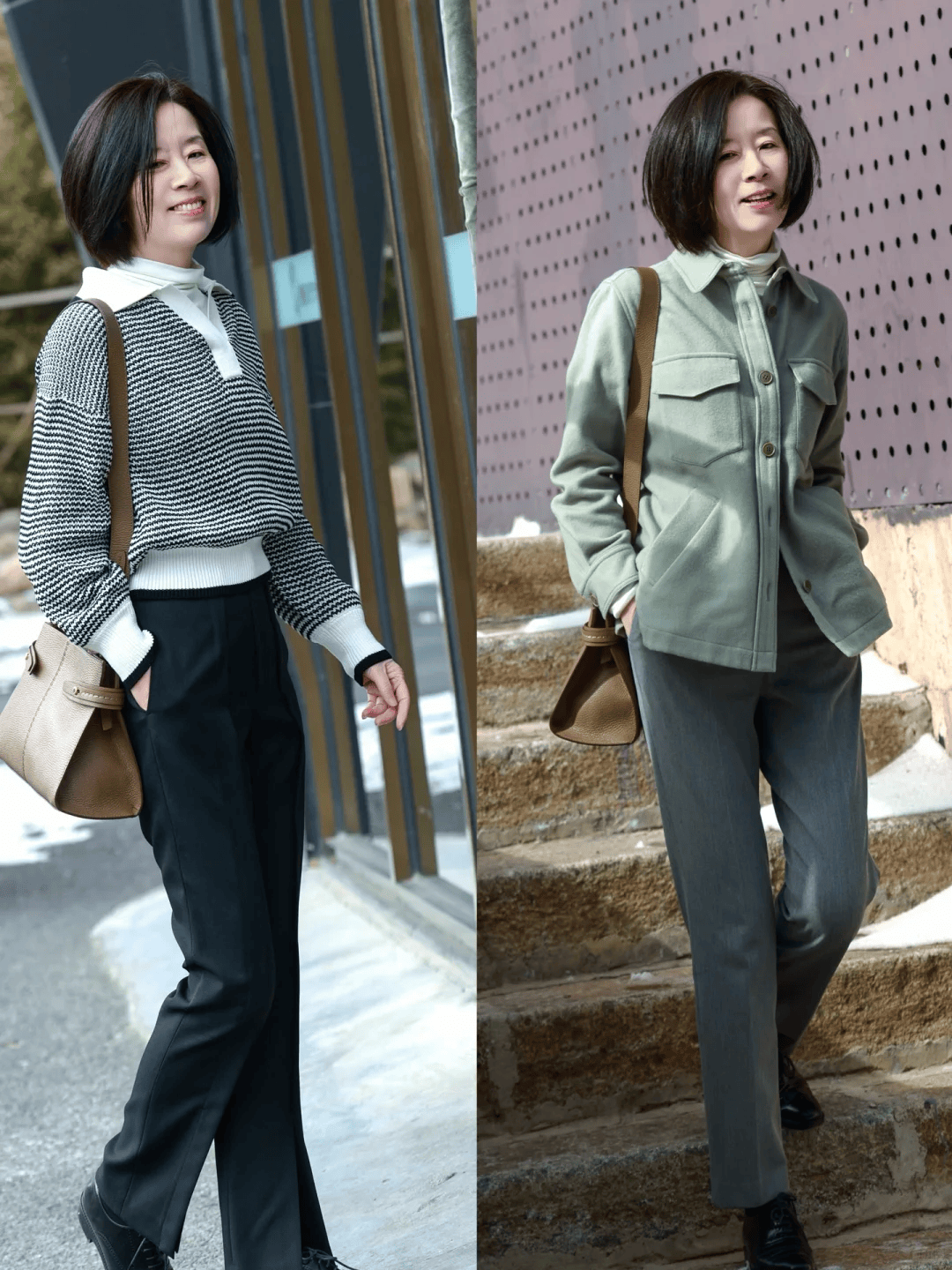 卡其色风衣搭配抹茶色针织衫,温柔又有层次感,特别适合50+女性打造春日优雅气质。下身搭配灰绿色烟管西裤,利落剪裁修饰腿型,同色系过渡和谐高级。脚踩棕色乐福鞋,再配上同色系卡其帆布包,整体色调统一柔和,通勤出游都得体大方,显瘦又显气质。