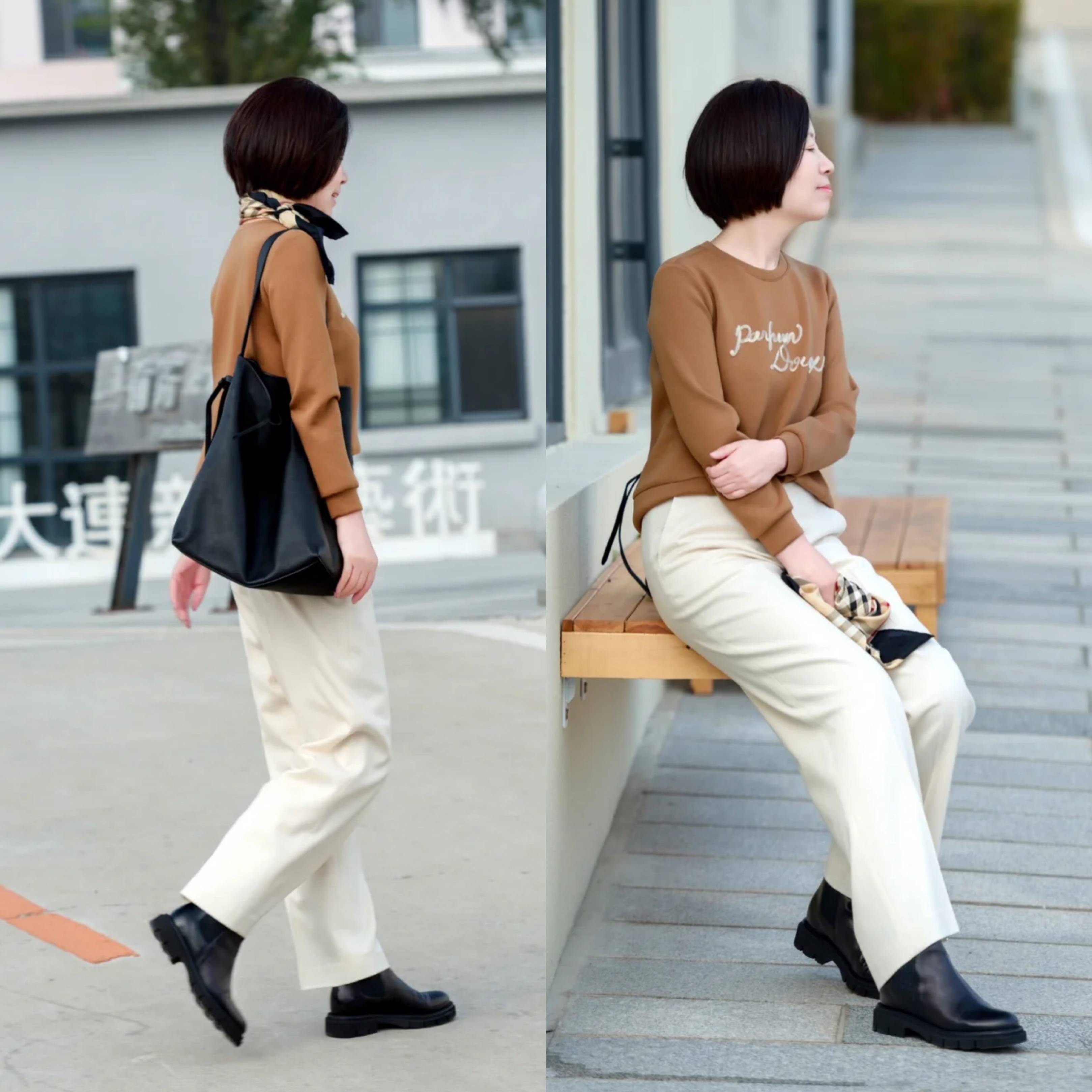 咖啡色卫衣搭配米白色烟管西裤,温柔又耐看,非常适合50+女性春季日常穿搭。宽松卫衣舒适减龄,米白烟管西裤利落挺括,完美修饰腿型,打造随性又精致的质感。搭配黑色短靴与同色系挎包,色彩呼应更显高级,整套搭配休闲不失优雅,显瘦显气质,通勤出街都很合适。