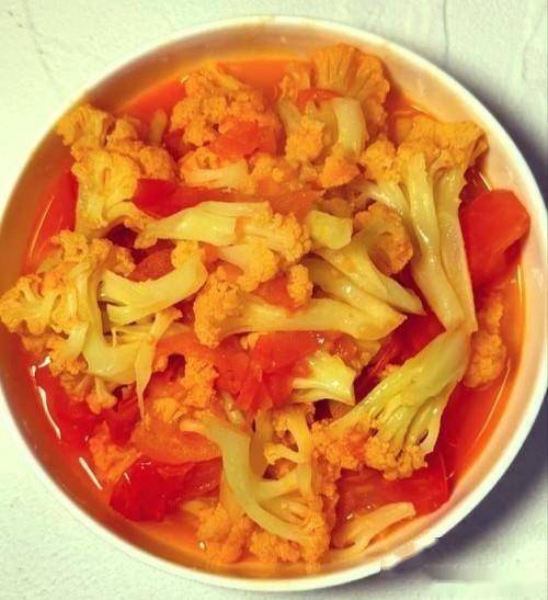 6. 放入焯好水的菜花,翻炒均匀,让菜花充分吸收西红柿的汤汁。