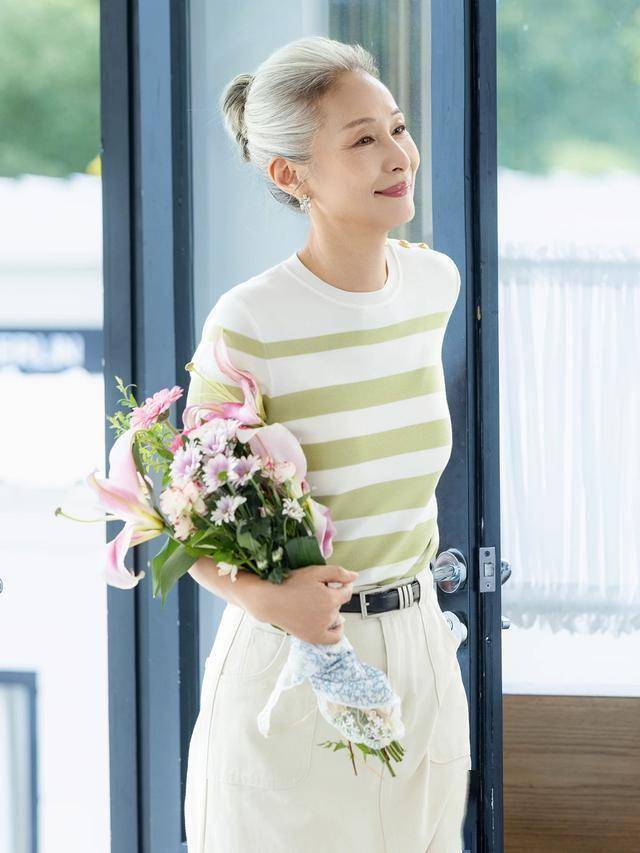 奶油绿条纹衫,清新又减龄,搭配白色牛仔直筒裤,显年轻10岁不止。