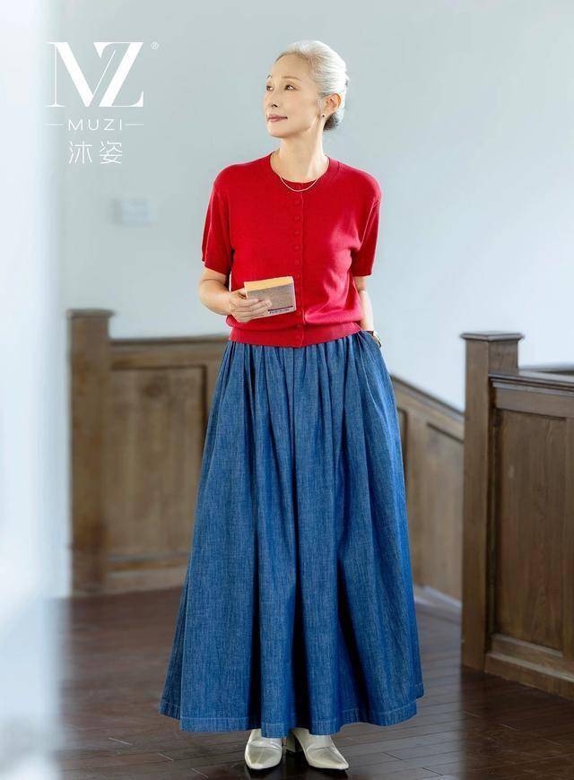 红色针织衫配牛仔蓝伞裙,充满着复古氛围,尽显视觉盛宴。
