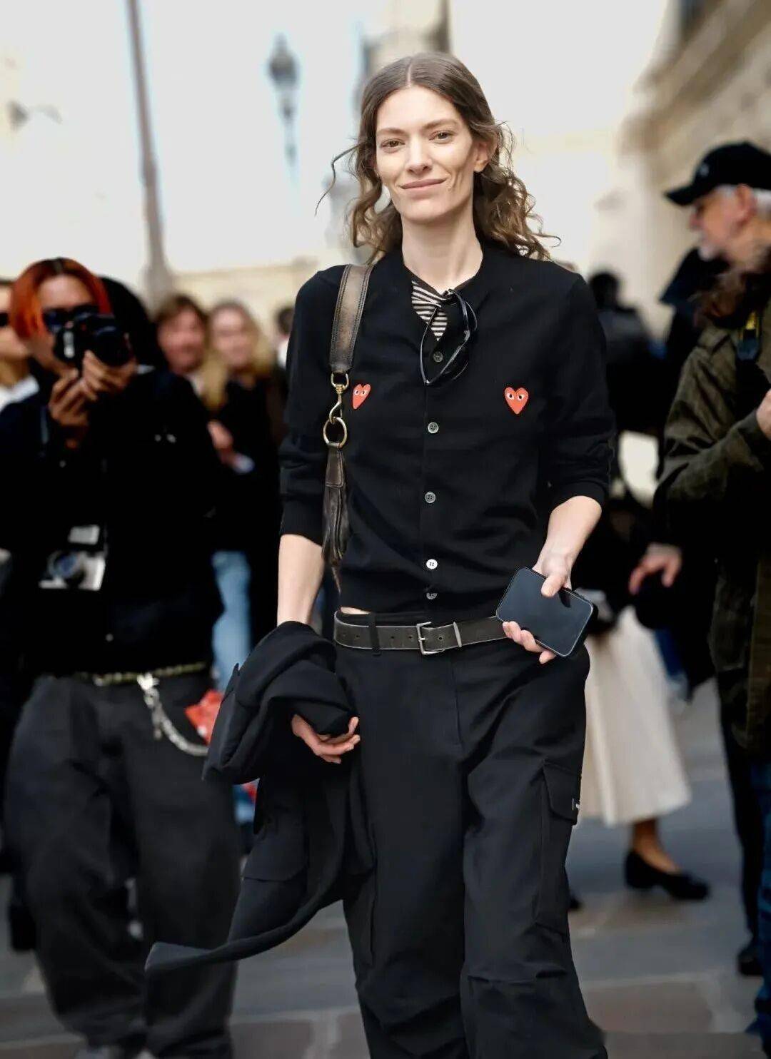 想要显瘦高级,黑色的针织衫搭配黑色阔腿裤,单一配色高级感拉满,而且模糊了腰线,显高效果OK,颜色又是最收敛的,显瘦第一名。