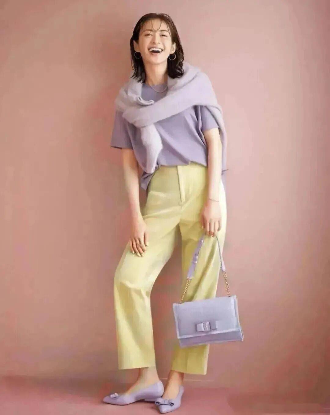 可以尝试一些彩色的阔腿裤,蛮喜欢鹅黄色的,它是一种淡淡的黄色,阔腿的裤型,增加了大气洒脱的腔调,搭配香芋紫色的T恤,非常减龄可爱的搭配。