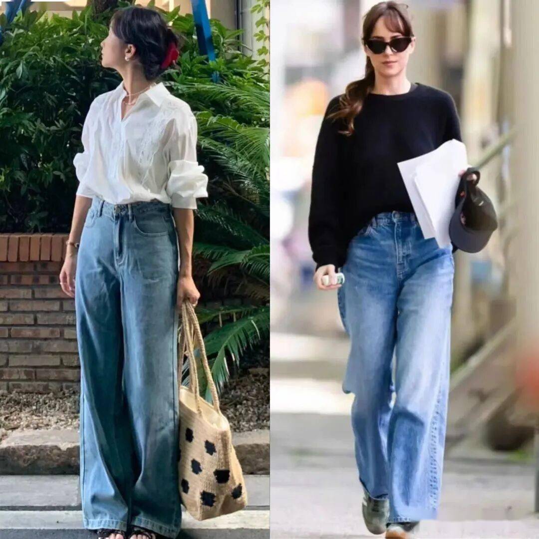牛仔阔腿裤,它会有一种很复古的故事感,同时又带着学院风的青春感,它可以搭遍你衣橱里所有风格的上衣,都不会有违和感。