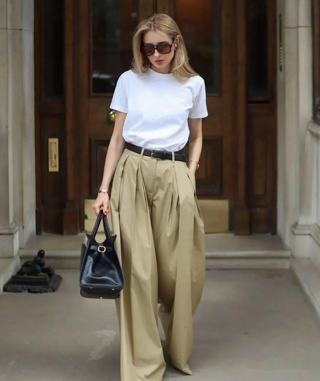 短款的白T搭配卡其色阔腿裤,可以选择将衣角塞进裙子里,露出高腰线,可以用腰带来勾勒出明晰的腰线,可以从视觉上拉长下半身的比例,打造出完美的3:7的黄金比,穿出大长腿。