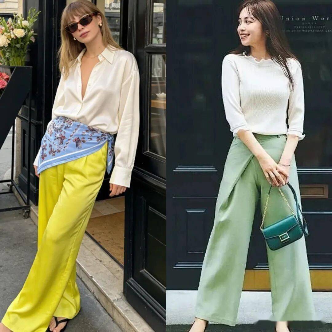 可以试试淡雅的薄荷绿色的阔腿裤,它的颜色特别清新干净,带着夏日的清凉感,可以配一件白色的上衣,更增加了温婉优雅的气质,超级好看。