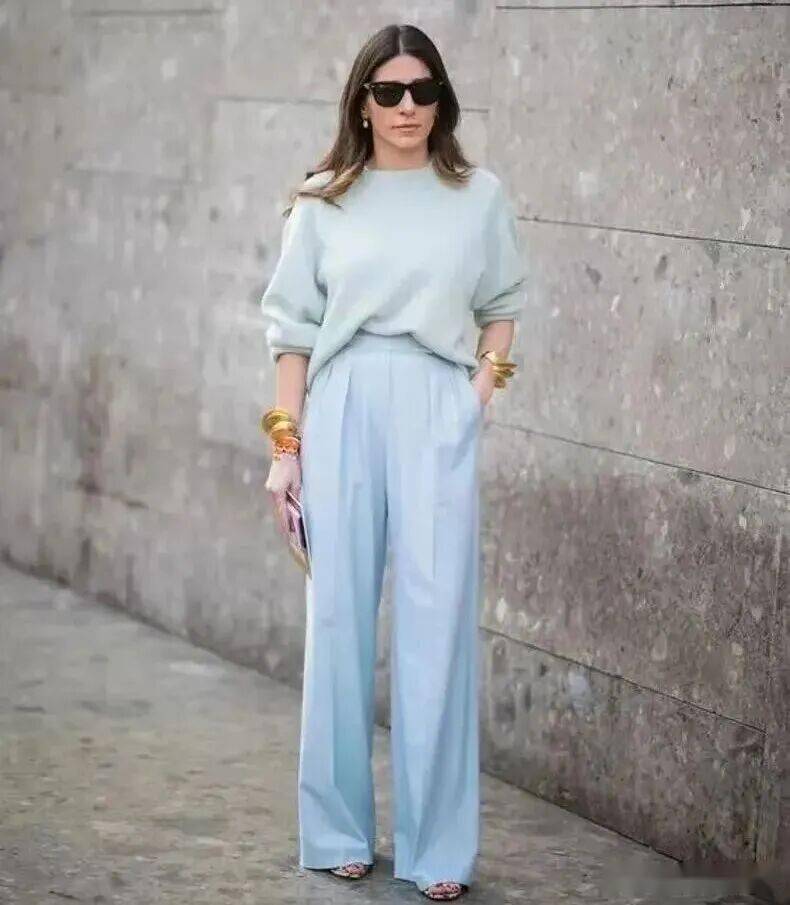 蓝色的阔腿裤,它有一种很清爽的感觉,减龄效果不错,可以配一件白色或是水蓝色的上衣,配色格外干净,营造出很优雅的少年感,去油腻效果OK。
