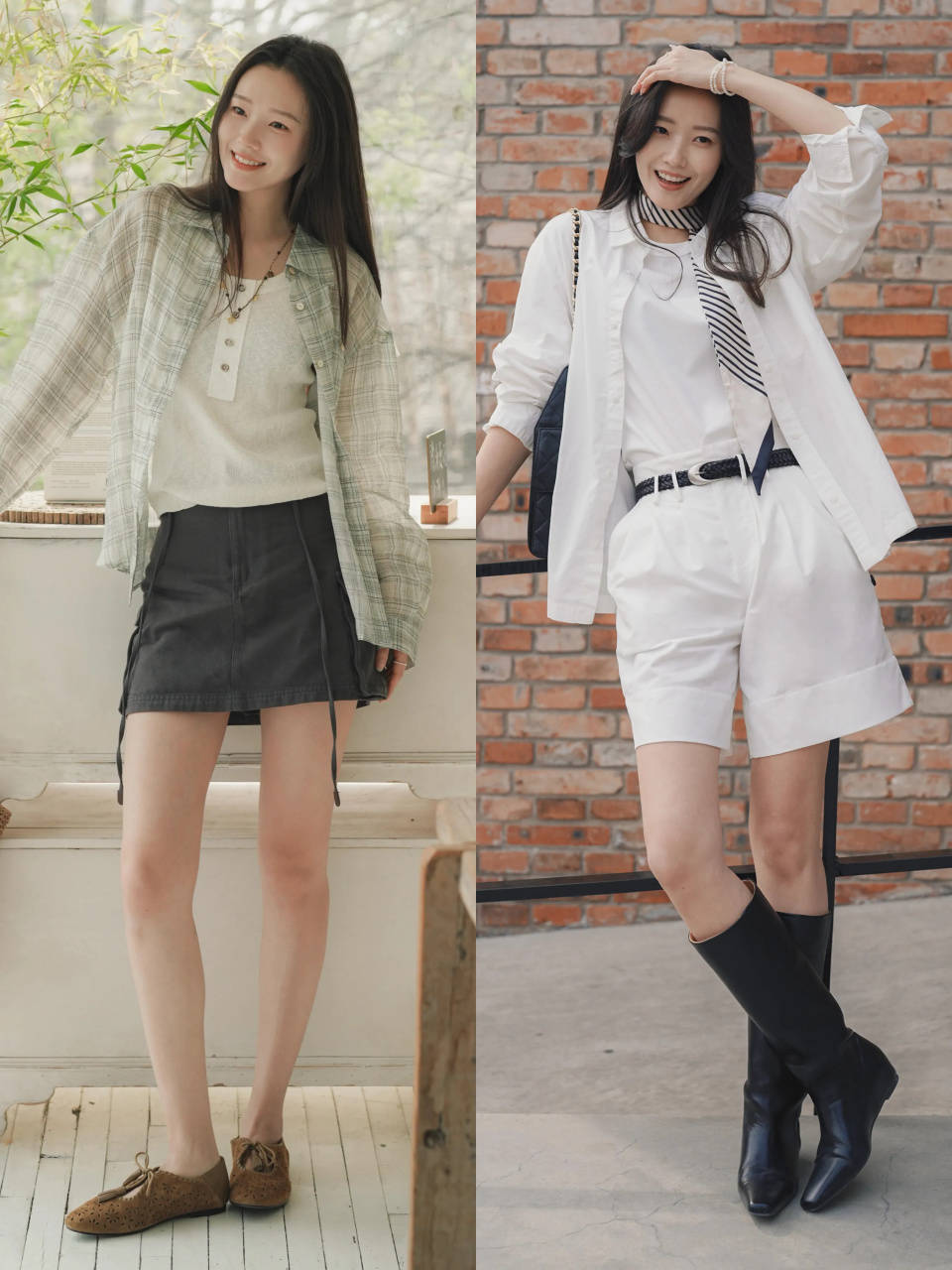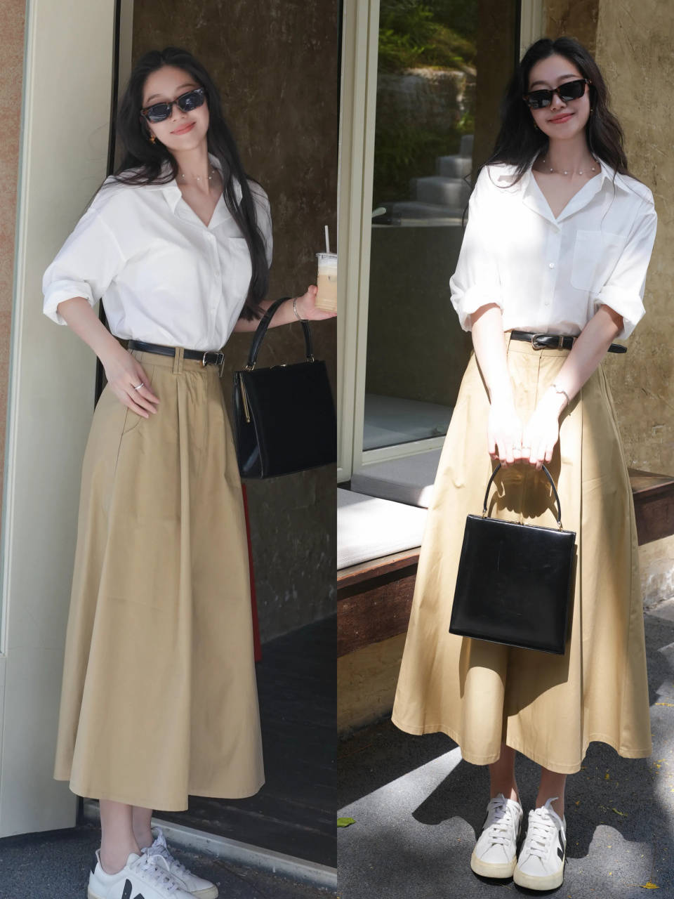 top③:卡其色衬衫+白色半身裙