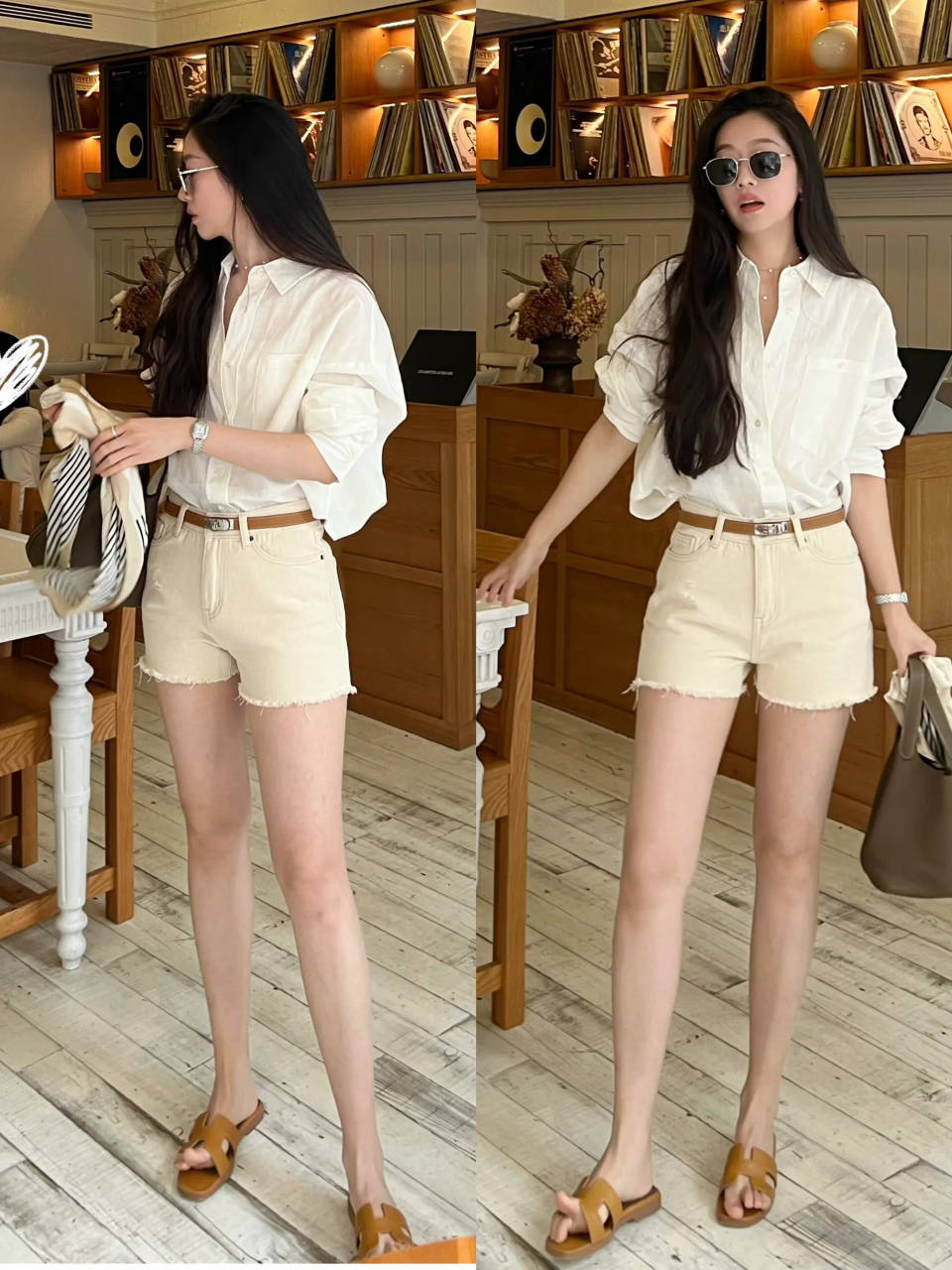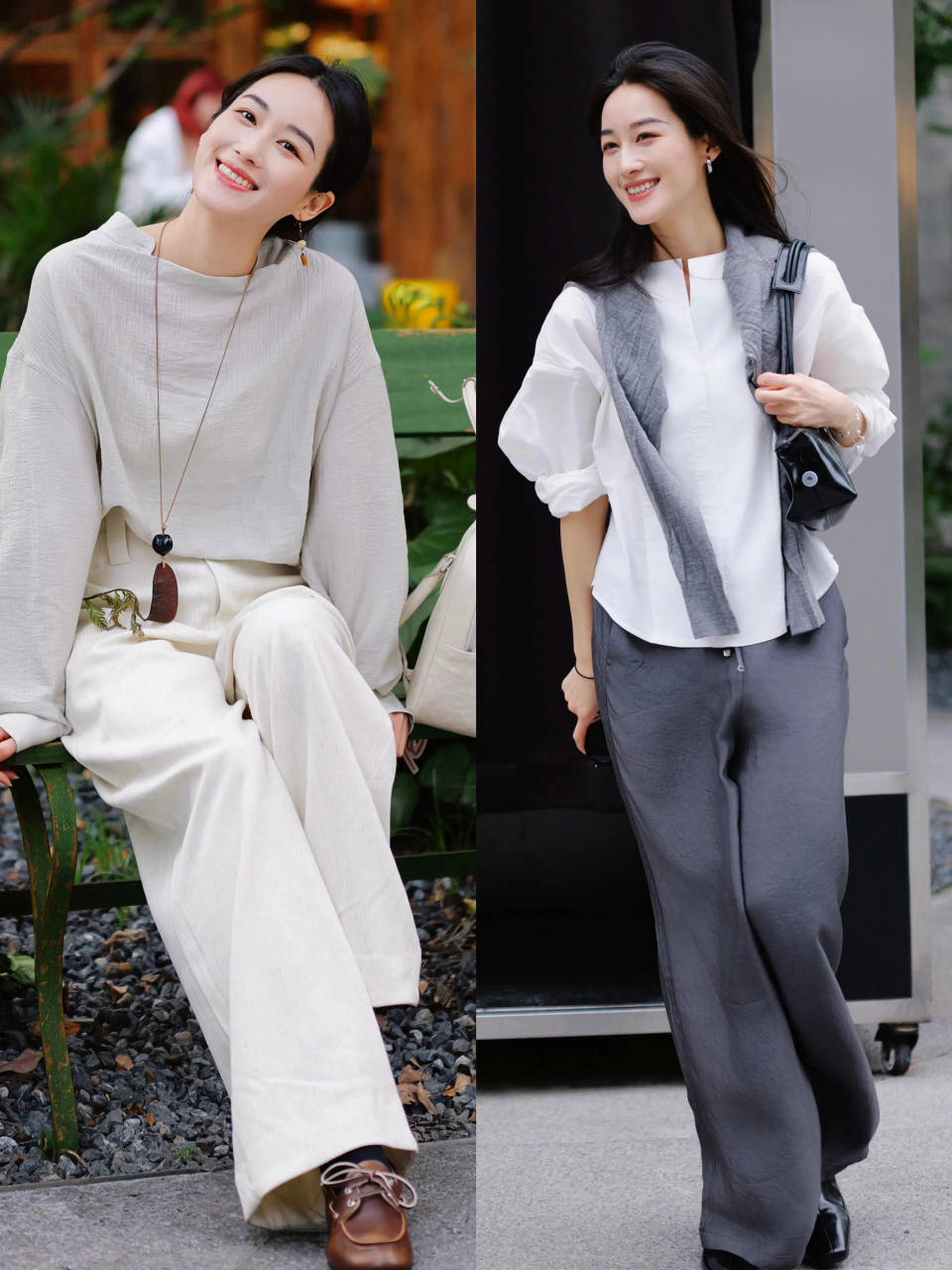 Tips①:棉麻白衬衫+白色直筒阔腿裤