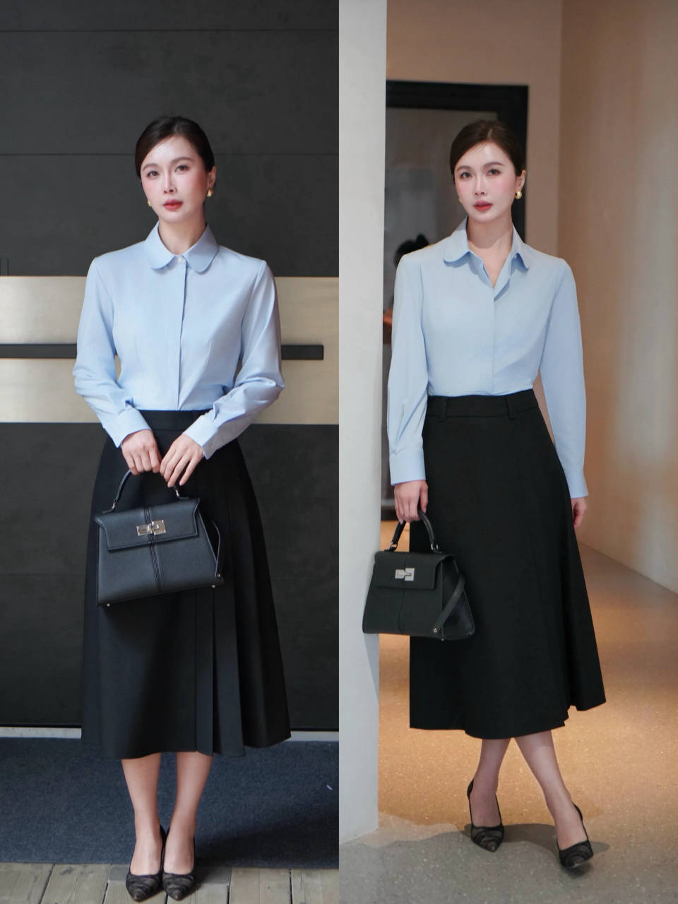 若是偏爱利落高级的轻熟风,可选一件天生就拥有时尚感的。小翻领蓝色衬衫上衣,配上黑色的百褶半身裙,或是深灰色的伞裙,这样的撞色搭配能增强你的气场与时尚感。