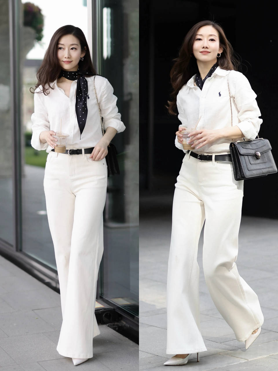 Tips②:白衬衫配白色牛仔裤,通勤洋气