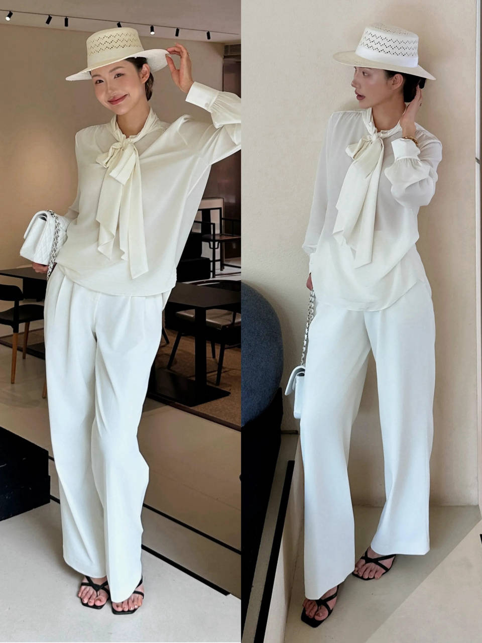 Tips③:雪纺衬衫搭配白色西装裤,利落又温柔
