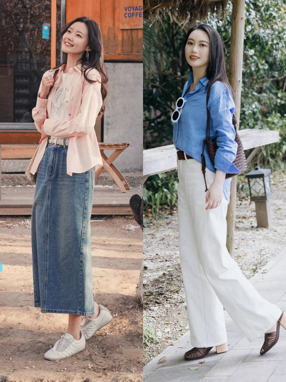 若是偏爱通勤职场穿衣风格,可选一件微宽松的小众白色衬衫,搭配上天生就拥有休闲感的白色牛仔直筒阔腿裤,即可遮住胯宽腿粗等问题。