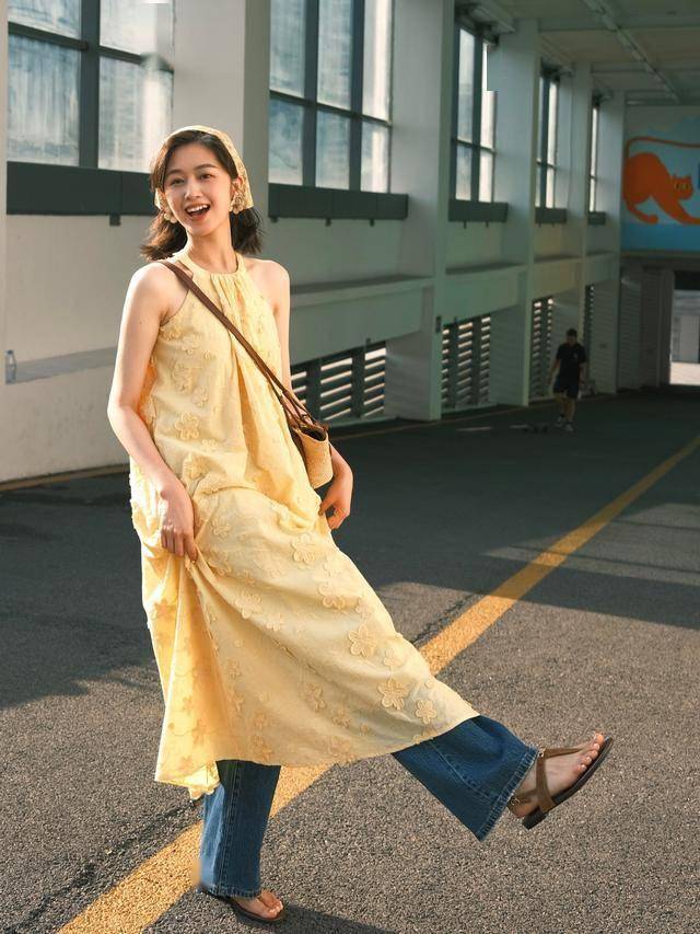 无需刻意秀出曲线,A字版型的挂脖连衣裙,配条经典的牛仔阔腿裤,照样很迷人。