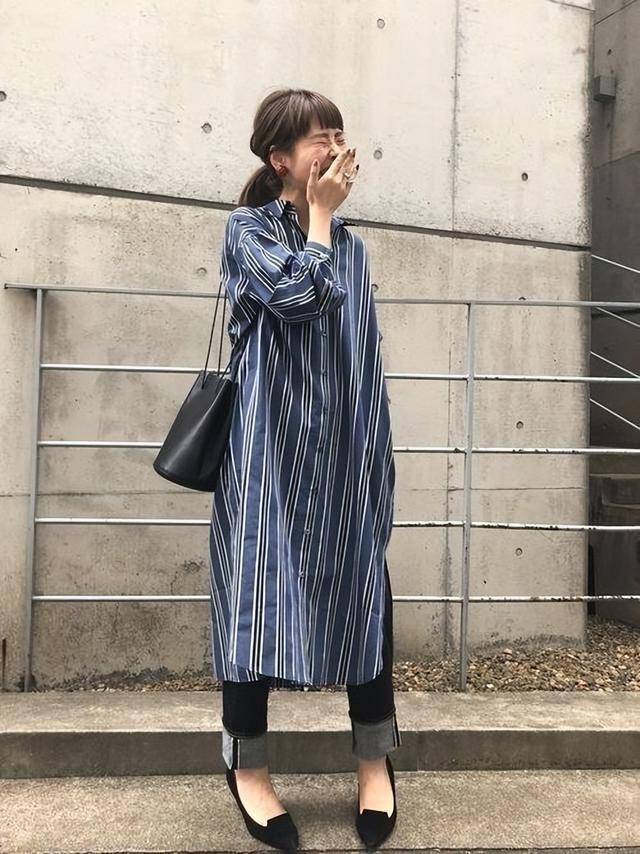 蓝色条纹衬衫裙,搭配上丹宁蓝小脚裤,松紧互补,立马显瘦一圈。