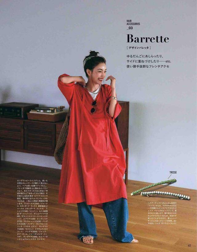 红色长裙,只需要配条深蓝色牛仔阔腿裤,就能平衡张扬感。