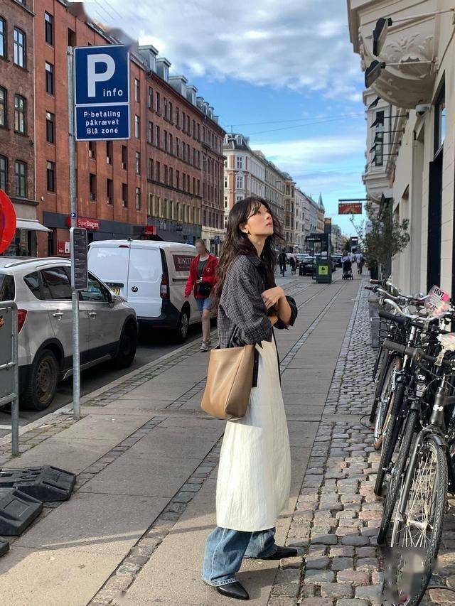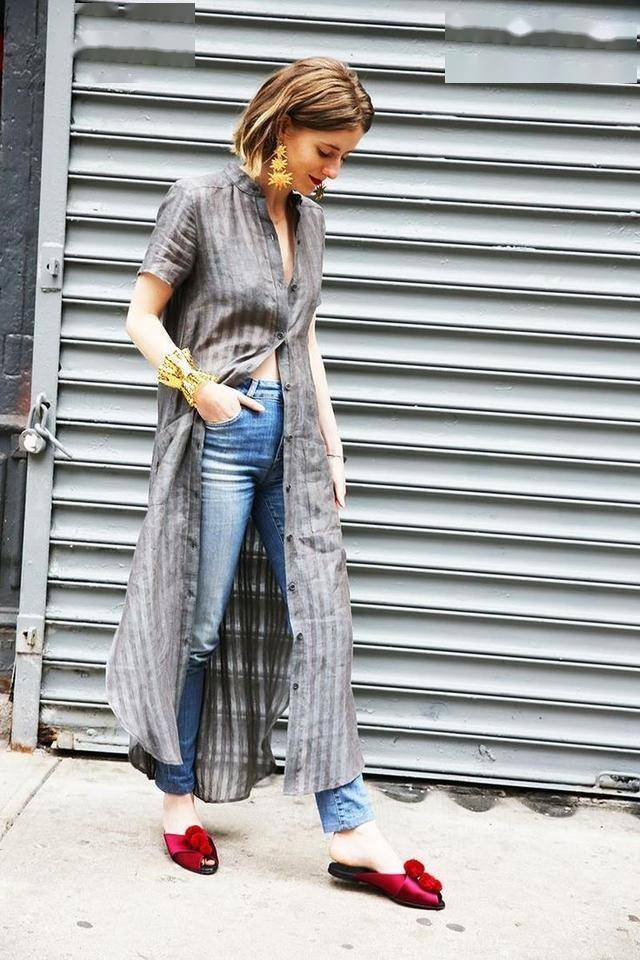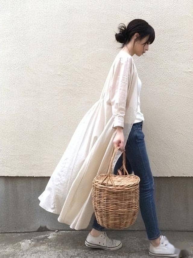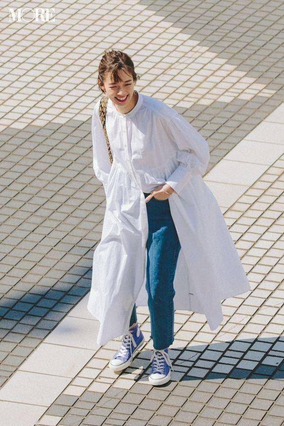 白色条纹衬衫连衣裙,搭配水洗蓝牛仔直筒裤,鞋子和裙子颜色呼应,看上去更协调。