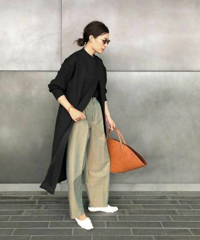 裙摆过膝,裤腿过踝,“长+长”的组合,配双尖头鞋就能规避拖沓感。