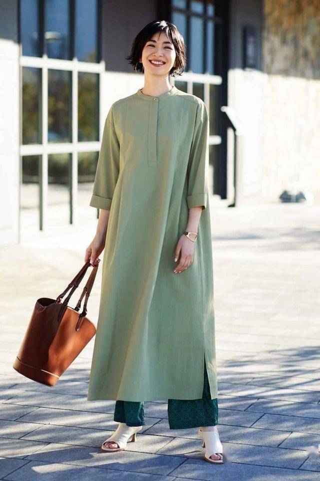 充满着生命力的森林绿,覆盖在长裙当中,显白又抬气色,配条米白色直筒裤,美的清新脱俗。
