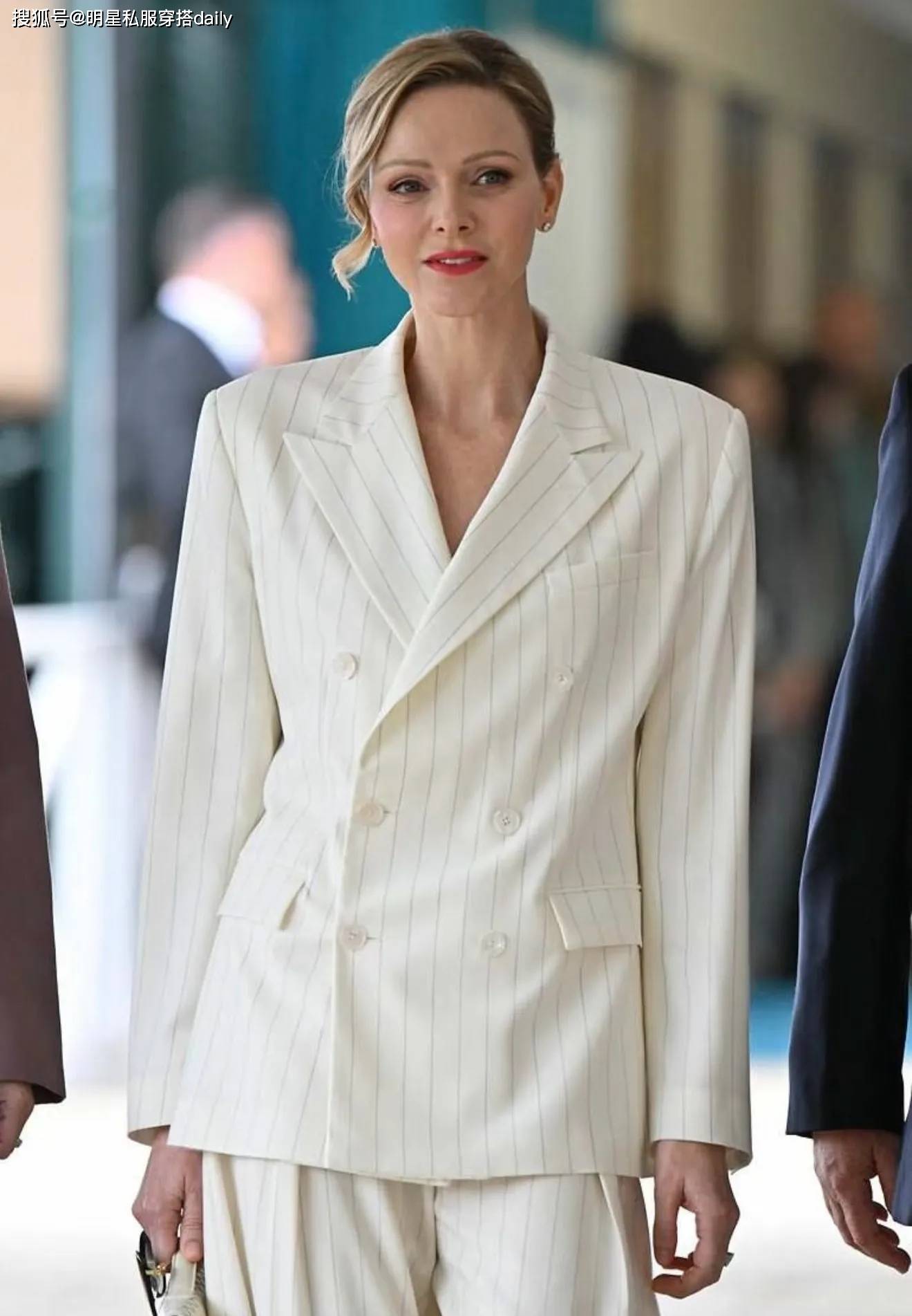 摩纳哥夏琳穿搭 Look1:白色竖条纹西装套装,优雅大气!