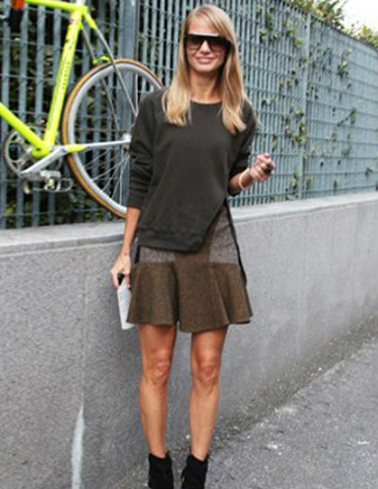 示范搭配:棕色卫衣+拼接色短裙+黑色短靴+墨镜