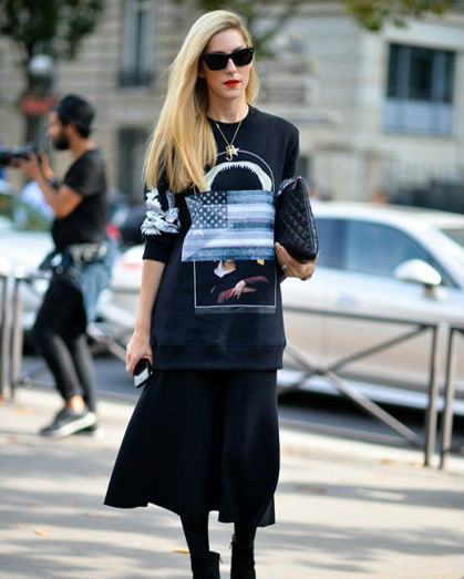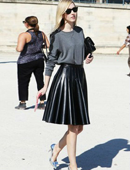 示范搭配:灰色卫衣+黑色及膝皮裙+银色高跟鞋+黑色手包+墨镜