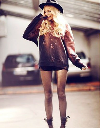 示范搭配:黑色卫衣+黑色短裤+透色裤袜+黑色高跟鞋+黑色礼帽