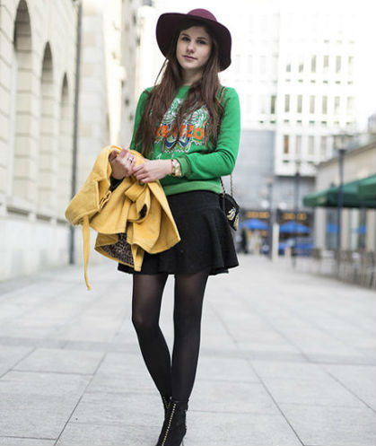 示范搭配:青色卫衣+黄色呢子外套+黑色短裙+黑色裤袜+黑色短靴+酒红色宽檐帽+黑色挎包