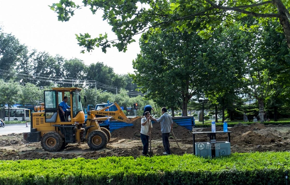 2015年8月21日,中共中央党校大门题字石已被移除,几名工人在整理裸露的地面。詹敏/东方IC