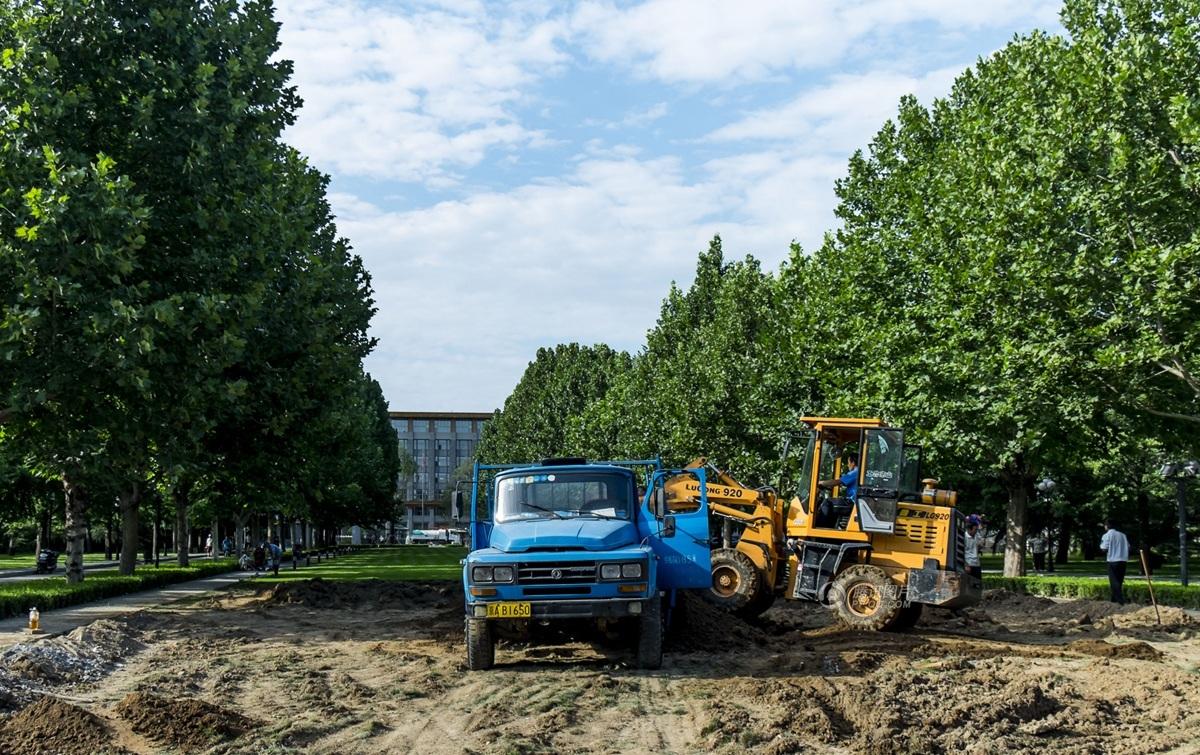 2015年8月21日,北京,海淀区大有庄100号中共中央党校。当日,中央党校门前题有“中共中央党校”的巨石已经被移走,大型施工机械正在现场施工,几名工人在整理裸露的地面。詹敏/东方IC