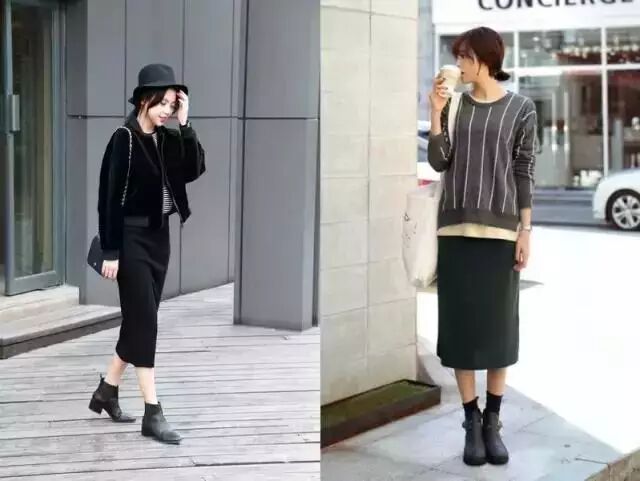 这样的套装简直是懒人的福音,只要套头衫+过膝裙+手拿包