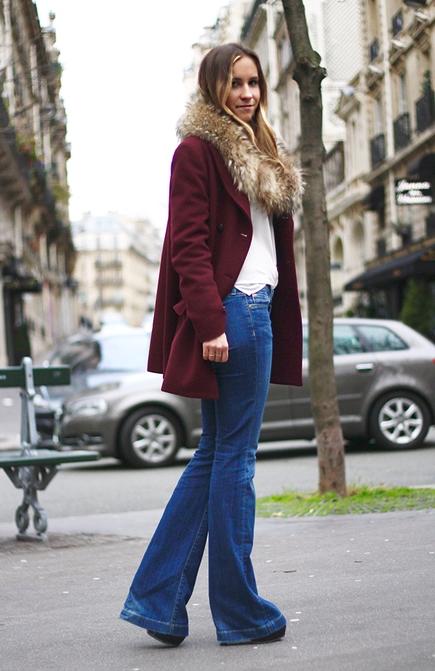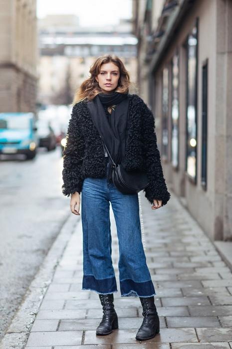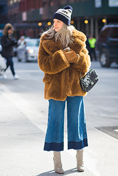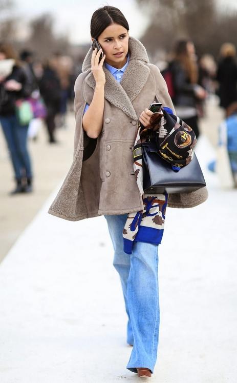 羊羔绒也是今年很热的款式,搭配牛仔蓝的阔腿裤,赞!