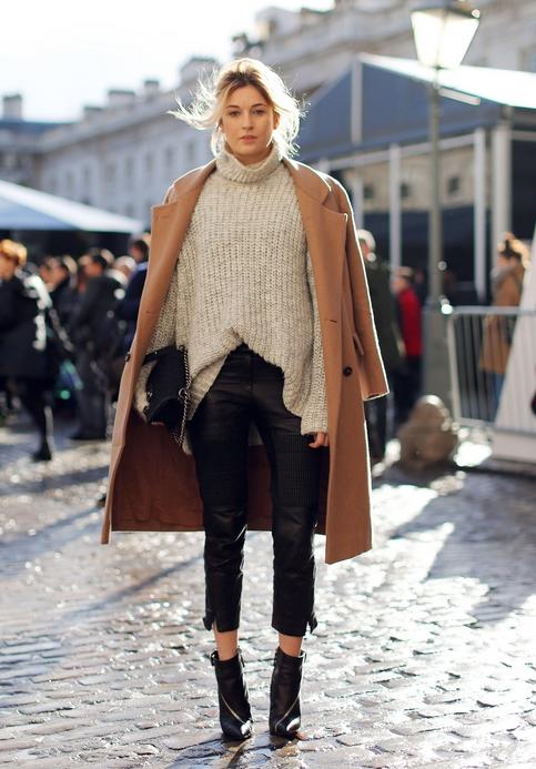 皮裤的小边微微外扩,搭配黑色的靴子,卡其色大衣和oversized毛衣,慵懒感十足哦!