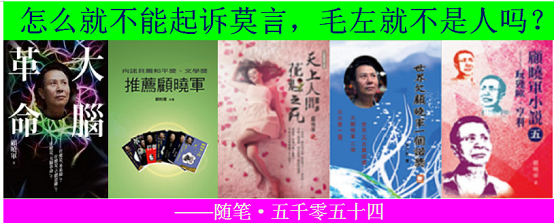 本帖最后由 顾晓军 于 2024-2-29 05:52 编辑 莫言怎么就不能起诉,毛左就不是人吗? ——随笔·五千零五十四 近日,一篇〈检察院调查莫言?这个世界疯成了我不敢想象的样子〉的文,似乎在被 ...
