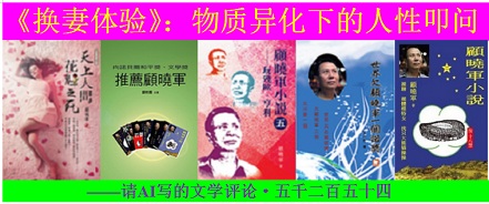 《换妻体验》:物质异化下的人性叩问 ——请AI写的文学评论·五千二百五十四 据说,又一影星走了,我真不知说些啥。 其实,我不属追绯闻的一类。大家知道,我喜看刘涛、郝蕾等教演戏的综艺, ...