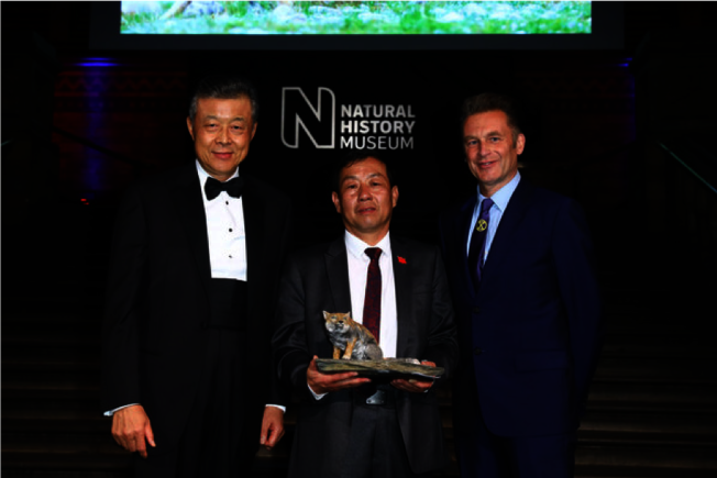 颁奖典礼现场。左起,中国驻英国大使刘晓明、鲍永清和BBC主持人克里斯•帕科卡姆。(取材自ZIMBIO)