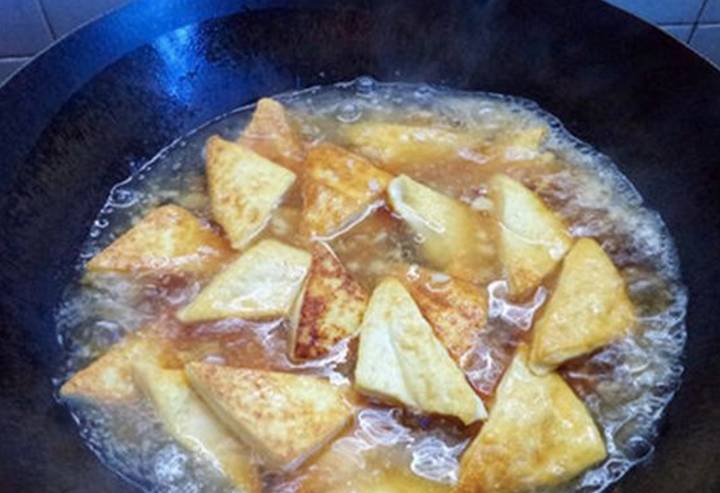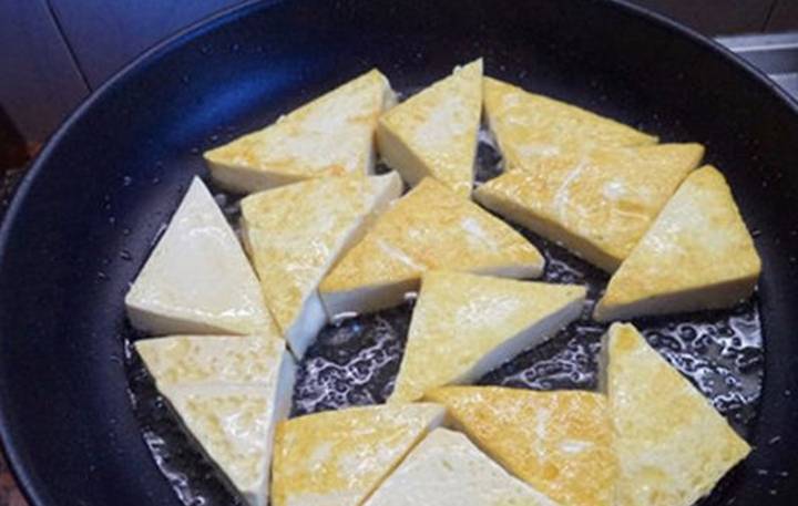 1、豆腐洗净对半切,然后热锅倒油,放在锅里煎,两面金黄色以后盛出来