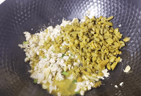 第4步:炒制酸豆角,将姜末、香葱炒香,加入猪肉末炒至变色,炒出香味,加入酸豆角同炒均匀,加点酱油烧一烧出锅。