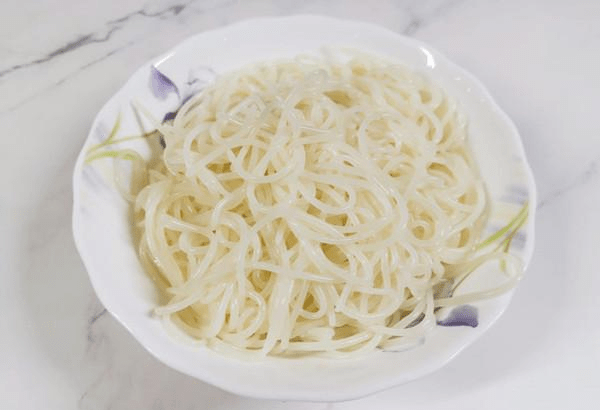 第3步:干米粉煮约10分钟后捞出,所选米粉或米线粗细不同,食材不同所用的时间不同,可根据食材定时间。捞出过冷水后,沥去水分备用;