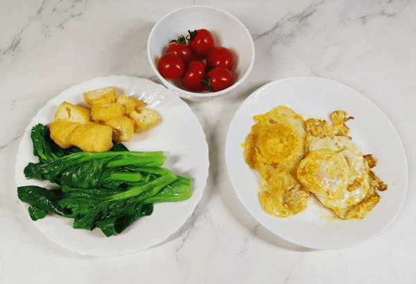 第2步:先开水下锅煮米粉,然后准备好煎蛋、小番茄、豆泡、青菜,青菜心可用开水焯水待用;