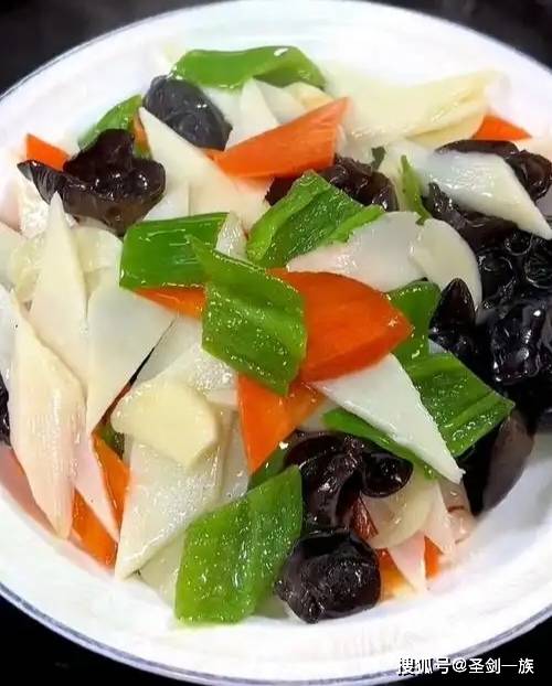 4. 加入山药片、胡萝卜片和木耳翻炒均匀。