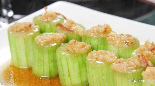 1.丝瓜去皮洗净,切成均匀的长段,切好的丝瓜墩摆在一个稍微深一点的盘子里。