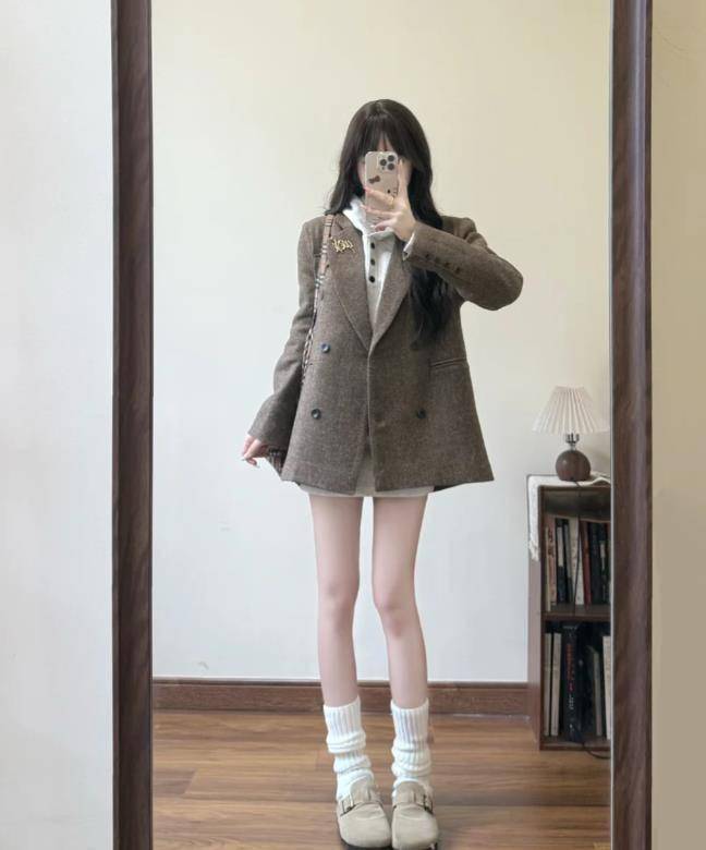 到了秋冬季节,穿搭上又可以利用起叠穿了,偏棕色的西装外套,这个色调还是挺好搭配衣服的,版型也很正,不会过于修身,也没有过分休闲,内搭一件连帽针织衫,下身配短裙,不大冷的秋天这么穿刚合适,特别是南方女孩子们,这么穿贼时髦。
