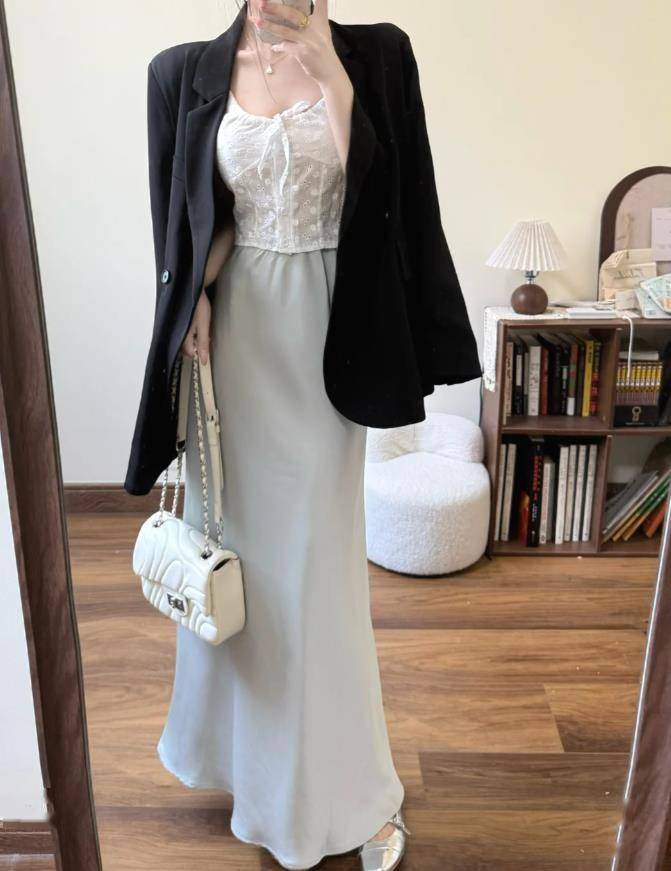 这个秋天,衣橱里又怎能没有一件西装外套呢?特别是这种经典黑的款式,无论怎样都不轻易踩雷。因为它的版型是相对宽松的,可藏肉显瘦了,选择一条缎面长裙来配,真的又帅气又不失女人味。这一套穿搭风格偏向姐姐风。