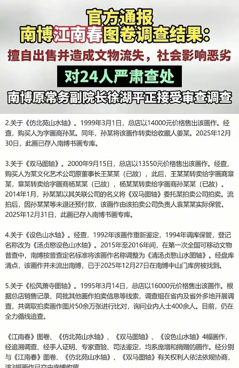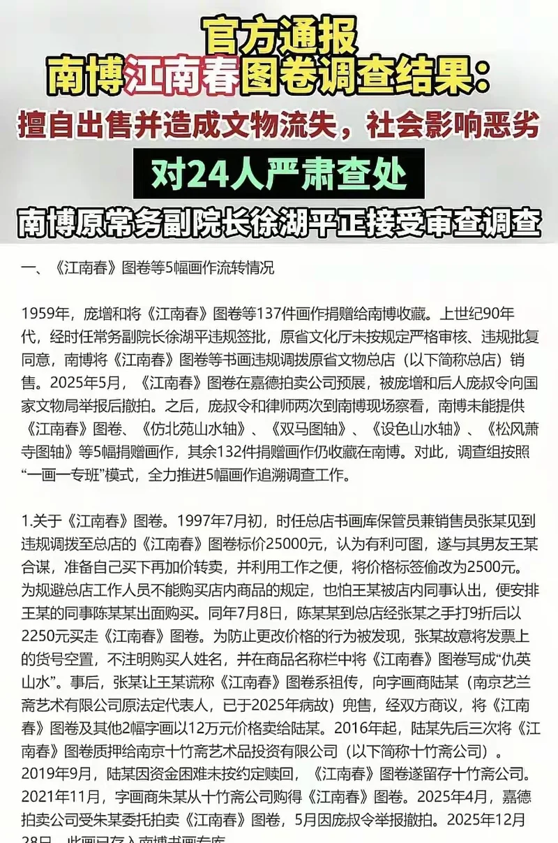 2025年5月,《江南春》图卷突然出现在嘉德拍卖预展现场,捐赠人后人庞叔令一看傻了,马上举报到国家文物局。调查组真是拼了,辗转12个省份,查档案查到头昏脑涨,6万多份材料翻遍,见了1100多人,连陈年旧账都扒拉出来。调查下来,五幅画四幅找回来了,《江南春》图卷弄得最曲折,1997年南博文创部张某竟然把标价从两万五搞成2500元,找关系买下,还九折,几番倒手后到朱某手里,差点被卖成拍品,最后因为举报撤拍,年底才追回回到南京博物院专库。