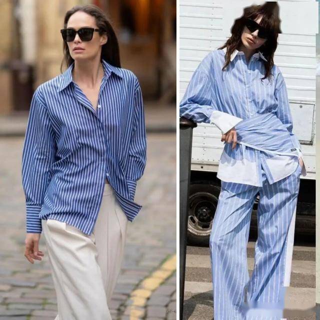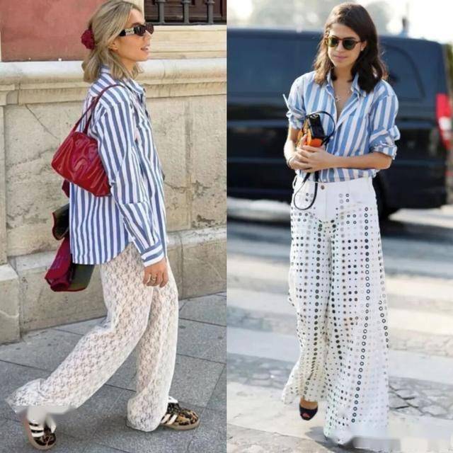 无论哪种颜色的条纹衬衫,都比较推荐搭配白色阔腿裤,没有违和感,又显得干净清新,减龄好看。