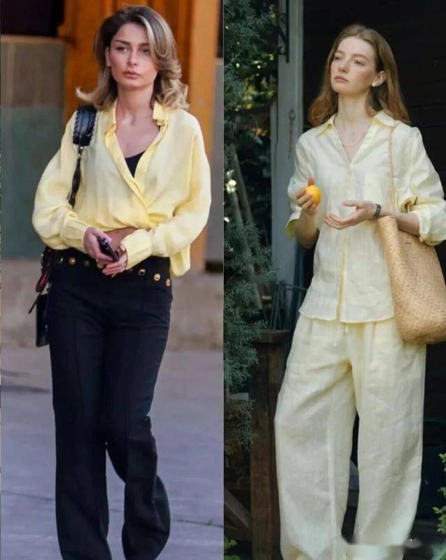 鹅黄色的衬衫,它是黄色中最浅的,对肤色不挑剔,搭配鹅黄色的阔腿裤,会给人一种奶呼呼的青春感,可爱又软萌。
