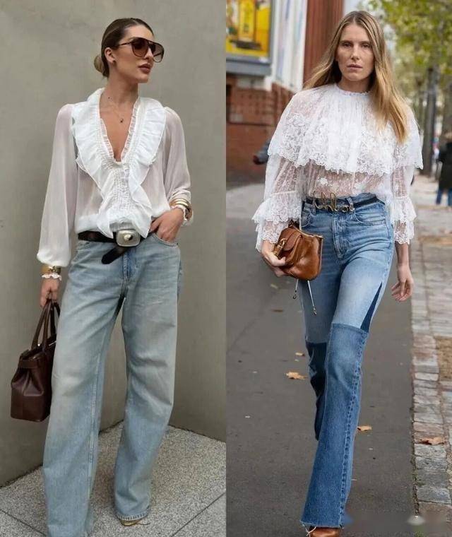 今年宫廷风的白衬衫出镜率也是非常高的,宽松一些带着慵懒的味道,配一条怀旧色的牛仔阔腿裤,带着复古感,又觉得摩登。