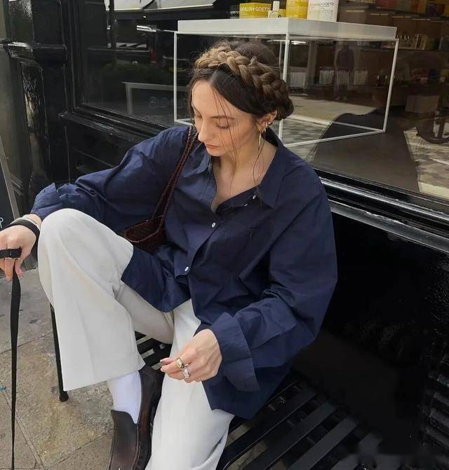 藏蓝色衬衫,它更接近于黑色,但比黑色要显年轻,经编辑部适合成熟一些的女生,可以穿出静谧、高级的质感,配一条白色阔腿裤,增加了清爽感,显白减龄的效果不错。